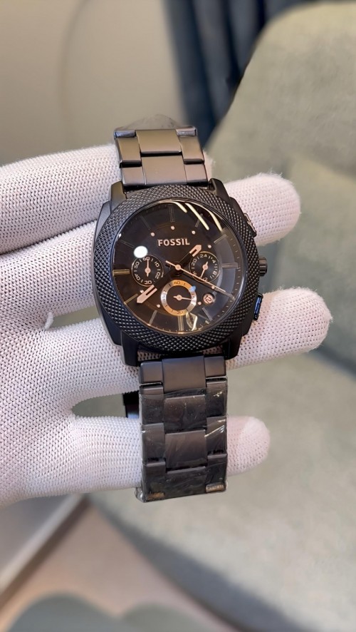 Fossil Machine Mid-Size Chronograph Black Stainless Steel Watch (model FS4656). Key features and product details include: Brand: Fossil Model: Machine Mid-Size Chronograph Model number: FS4656 Case Size: 42 mm Movement: Quartz Chronograph Platform: Machine Strap Material: Stainless Steel Strap Color: Black Features: Chronograph Function: Includes 2-3 subdials for measuring time intervals Material: Made of matte black Stainless steel Design: Minimalist design with a focus on functionality and style Setting the time and date: To set the day, pull the crown to the third position and rotate clockwise. Then, set the time and push the crown back to the normal position.
