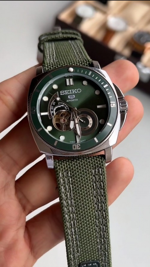 Seiko 5 Sports watch with a green fabric strap and a green dial. The watch features a stainless steel case and luminous hands and markers. The watch also has an open heart design, showcasing the automatic movement.